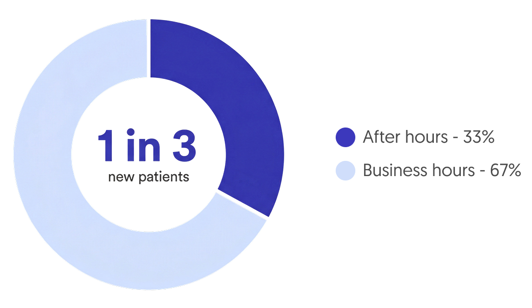 According to data from one of our clients, 1 in 3 new patient charts were created outside of clinic operating hours. These are patients who would have gone to voicemail—or simply called another practice—without an AI agent in place to capture their information and schedule their first visit.